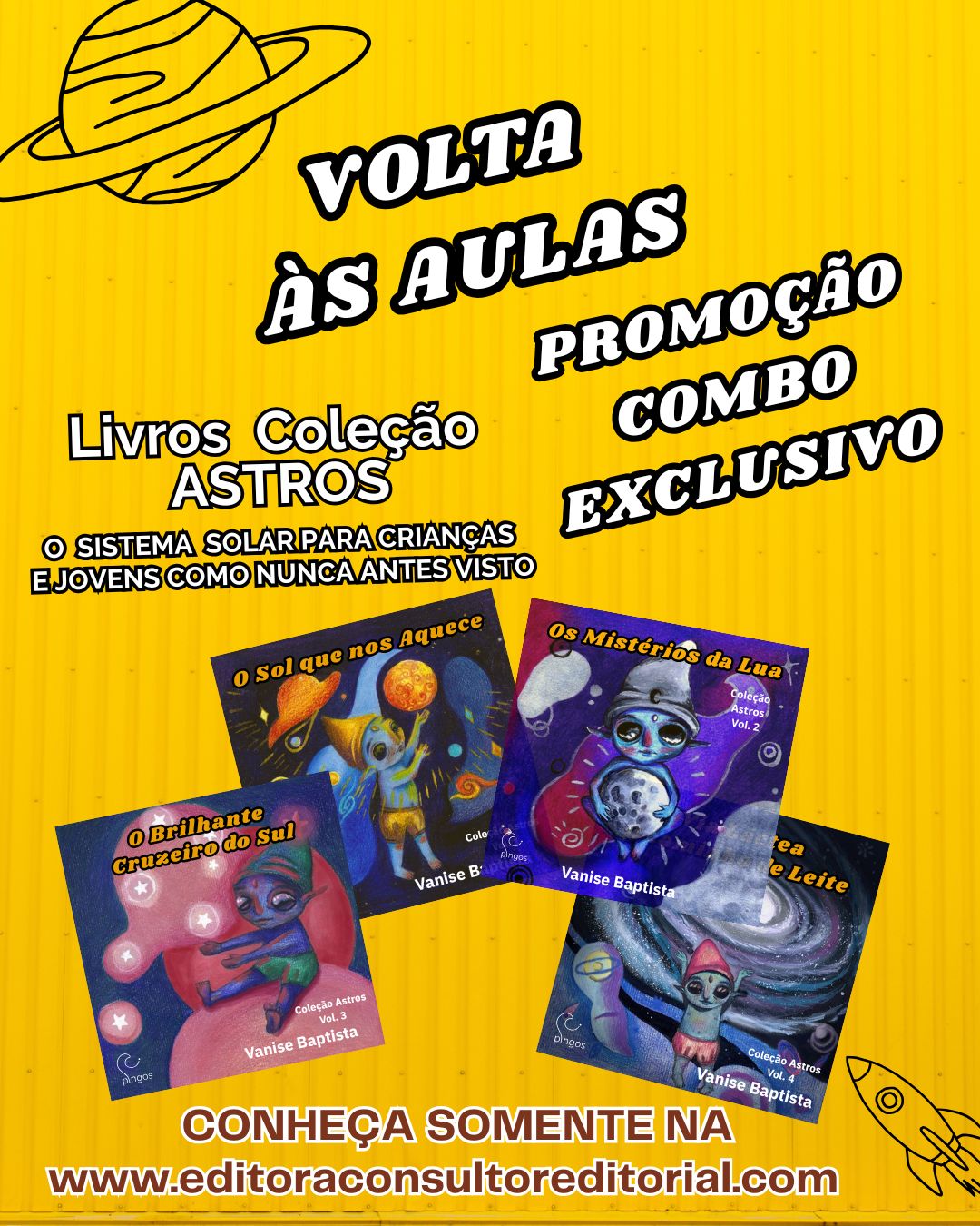 A Editora Consultor Editorial apresenta a Coleção Astros em um combo promocional exclusivo, pensado para acompanhar o início do ano letivo com leituras que despertam curiosidade, imaginação e interesse pela ciência. Reunindo títulos como O Sol que nos Aquece, Os Mistérios da Lua, O Brilhante Cruzeiro do Sul e O Caminho de Leite, a coleção convida crianças e jovens a explorarem o sistema solar de forma poética, sensível e acessível, transformando conceitos científicos em experiências de leitura envolventes — uma escolha especial para escolas, educadores e famílias que desejam começar o ano com conhecimento e encantamento.