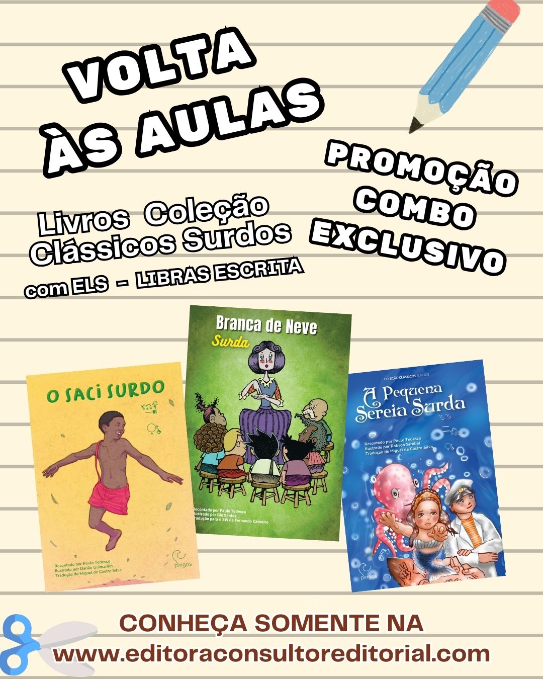 Para a volta às aulas, a Editora Consultor Editorial apresenta a Coleção Clássicos Surdos, um combo exclusivo de livros adaptados com ELS – Libras Escrita, pensado para promover uma leitura verdadeiramente inclusiva. Reunindo títulos clássicos como O Saci Surdo, Branca de Neve Surda e A Pequena Sereia Surda, a coleção amplia o acesso à literatura para crianças surdas, valorizando a diversidade linguística e cultural desde a infância. Uma proposta ideal para escolas, educadores e famílias que acreditam na educação como espaço de pertencimento, imaginação e direito à leitura para todos.